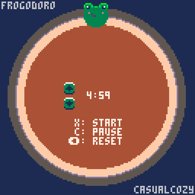 This simple frog-themed timer was made in PICO-8. In addition to pixel art animations, the timer can be adjusted (1-60 minutes) and there is an end-of-round sound effect to notify you when it's time to break or begin your focus session again.